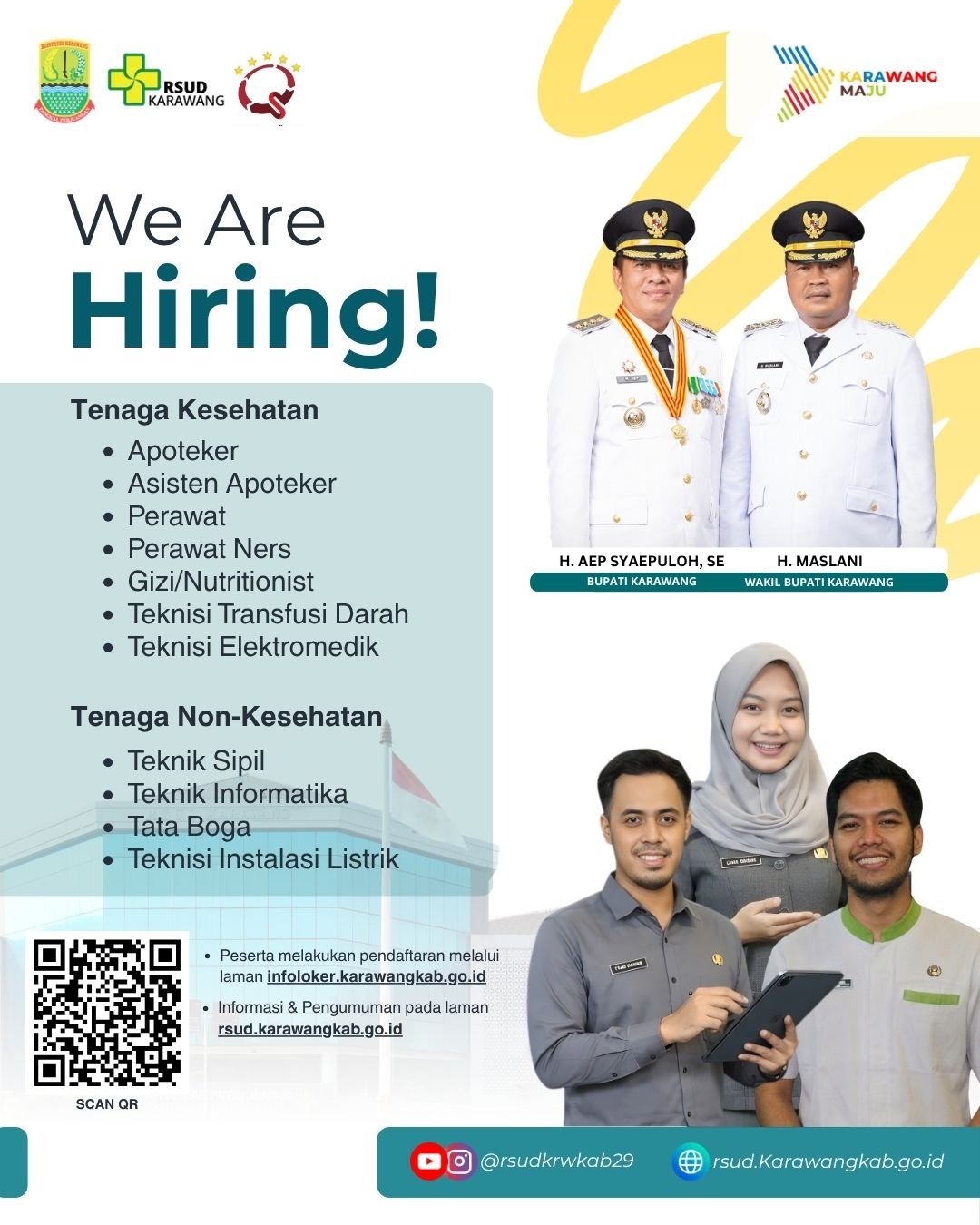 Dalam pengumuman tersebut, RSUD Karawang membuka peluang bagi tenaga kesehatan maupun tenaga non-kesehatan guna memperkuat pelayanan rumah sakit dan meningkatkan kualitas layanan kepada masyarakat Kabupaten Karawang.